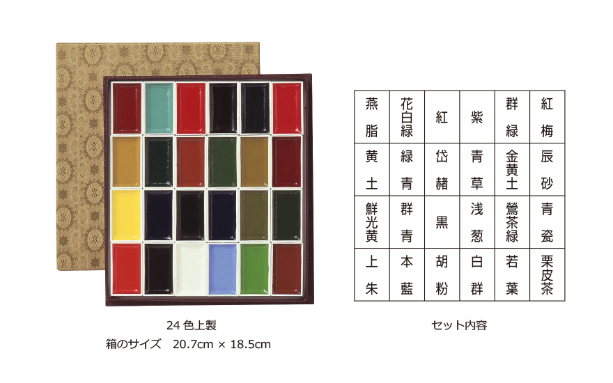 従来の深みのある日本画の色彩に加えて、鮮やかな色彩もラインナップしているため、時代の多様化に合わせた創作に対応し、その鮮やかさは作品に輝きをあたえます。